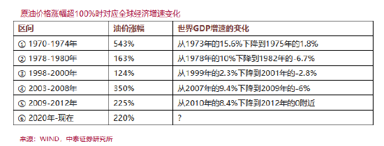 从前面五次原油大涨来看,虽然其直接原因各不相同,但油价大涨后都出现了全球经济增速大幅下滑。