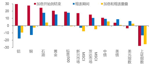 从上图可以发现,在上一轮加息和缩表重叠期间,大部分大宗商品价格出现了下跌,新兴市场的MSCI指数跌幅大于成熟市场的MSCI指数,而且,上证指数的跌幅超过25%。